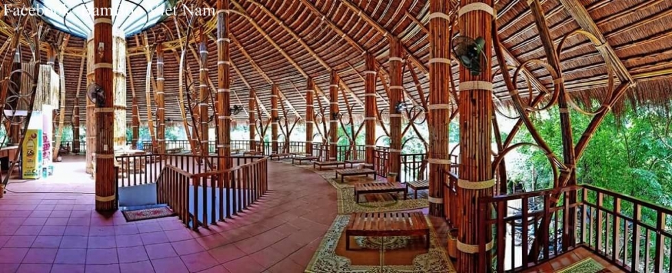 Kiến trúc nhà sàn được lợp mái lá là nơi cho các hội nhóm tổ chức kỉ niệm liên hoan Các tạo hình họa tiết thiết kế đều từ tre trúc uốn Thợ thi công dựng nhà tre mái lá Những chiếc ghế tre sẽ thay thê cho các loại ghế sắt, nhôm... tại nơi đây Bàn tre ép cùng là các vật dụng được đưa vào sử dụng tại khu nghỉ ngơi caffe